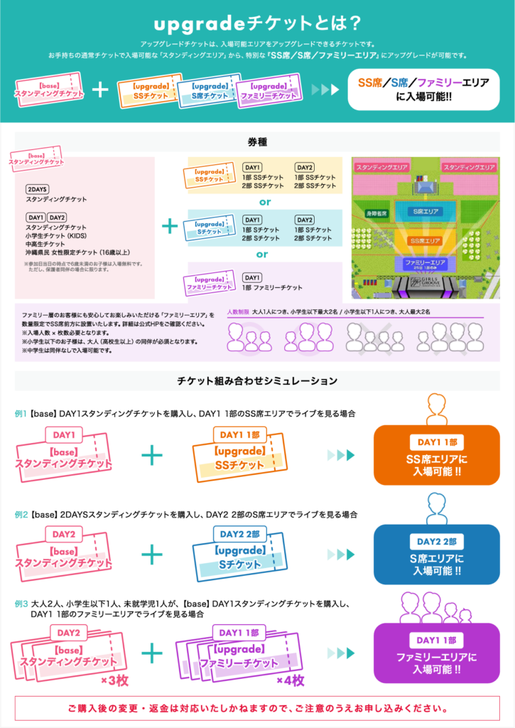 upgradeエリア(SS/S/ファミリー)でご観覧いただくには、「baseチケット」と「upgradeチケット」の2枚が必要です。